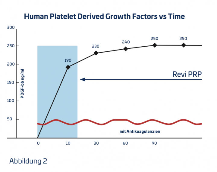 - sowie der Zeitpunkt der Aktivierung – und zwar ohne die Verwendung von Koagulanzien (siehe Abbildung 2). Bereits innerhalb der ersten 10 Minuten nach Aktivierung werden bis zu 90 % der Wachstumsfaktoren freigesetzt (Abbildung 2). Wird die PRP mit Koagulanzien versetzt, bleibt diese Aktivierung jedoch aus, was die Wirksamkeit erheblich beeinträchtigen kann.